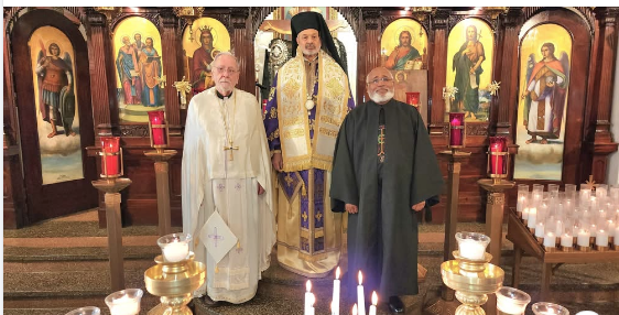 Archimandrite Eugene Pappas, His Grace Bishop Demetrios of Mokissos, and Deacon Angelos at Three Hierarchs Church in Brooklyn. Photo: TNH/Michael Kakias